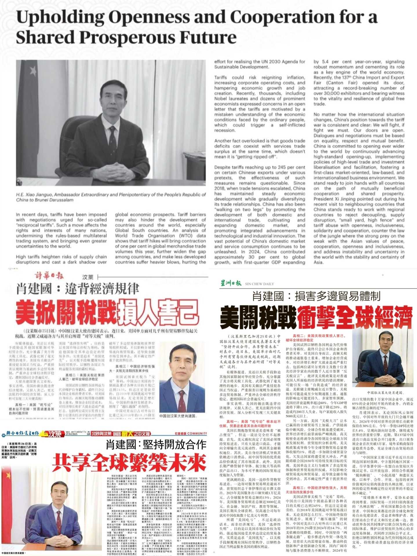 Recently, Brunei's newspaper Borneo Bulletin, United Daily, Sin Chew Daily and See Hua Daily published the article entitled Upholding Openness and Cooperation for a Shared Prosperous Future by H.E. Xiao Jianguo, Ambassador of the People’s Republic of China to Brunei Darussalam. The full text is as follows:
